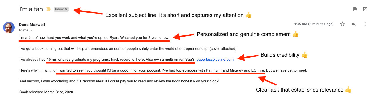 Good question about Dane’s email—I think a monetary exchange can be totally relevant in an outreach email (and sometimes arguably important if you’re specifically reaching out with the intention of selling something)… I’d gotten to know Dane virtually through some social media exchanges over the years and I was familiar with his work at the time he reached out to me, so it made a lot of sense to dive right into a conversation.