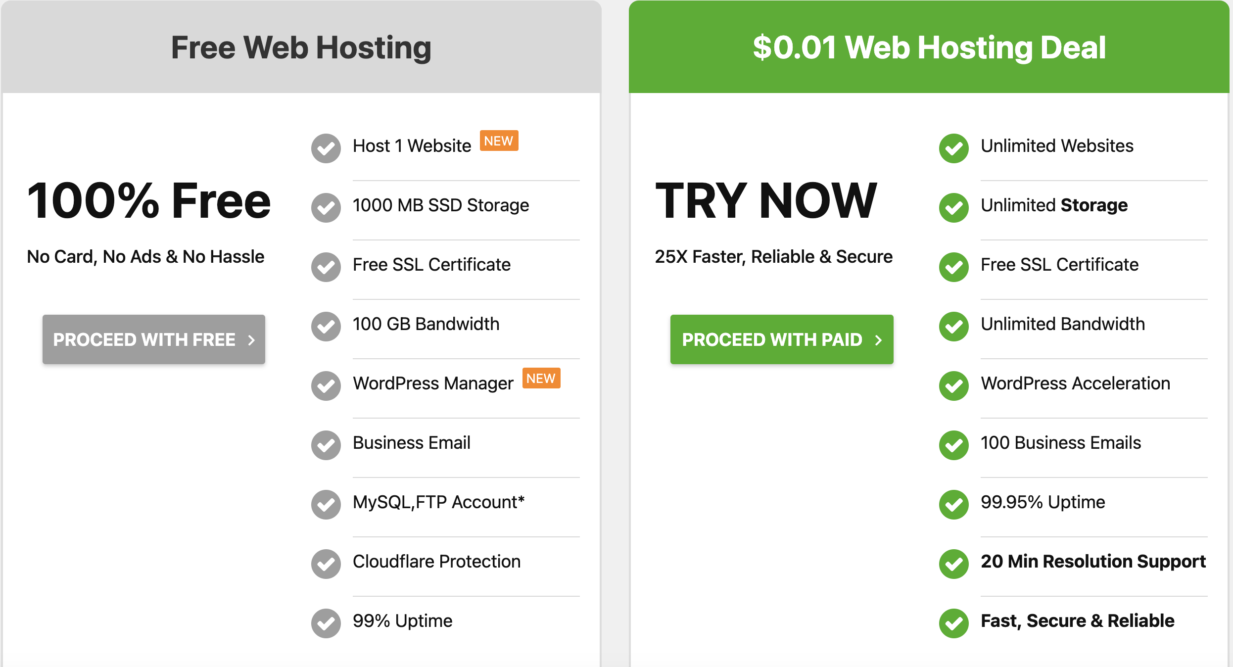 If you’re looking for reliable, trustworthy and affordable hosting, then Bluehost will definitely be a good choice for you to go with. While they don’t offer free web hosting plans, their 30-day full money-back guarantee ensures that you won’t waste anything on a paid plan you’re not happy with. One great thing about Bluehost, is that they offer packages that suit many different hosting needs too. Check out Bluehost’s $1.99/mo plans and see if they’re a good fit for your budget hosting needs today.