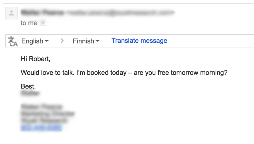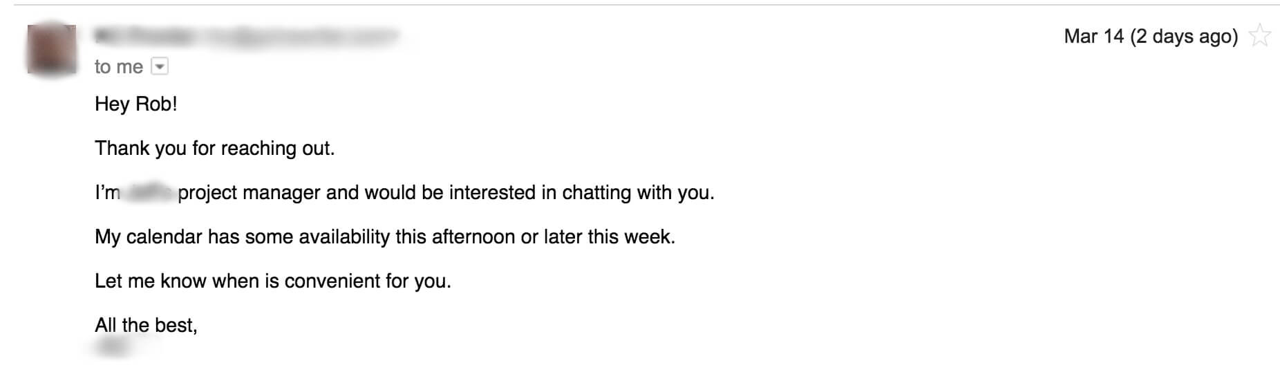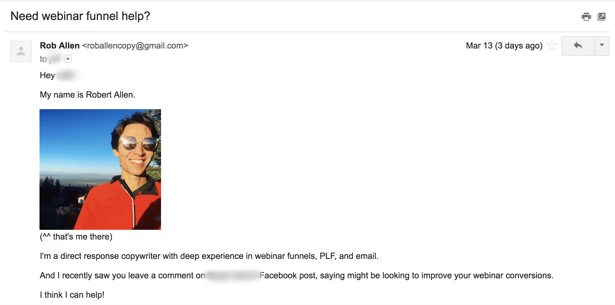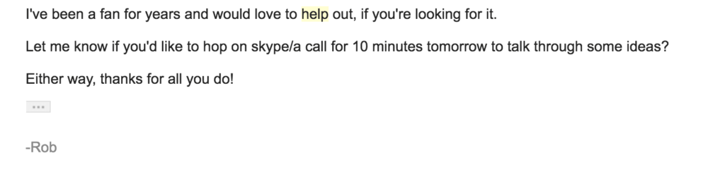 - The picture of me. While the picture might seem weird to include, I’m doing it for a reason. This guy likely gets thousands of emails per day and I needed to do something to stand out. The subject line I chose helps, but this image makes that email pop. You might think: “Who does that?” But that’s exactly the point! Plus, it kind of humanizes something that can seem SUPER impersonal: a cold outreach email.