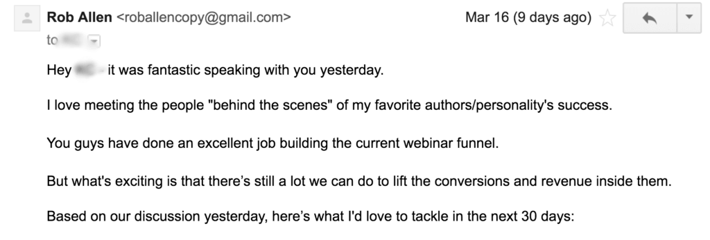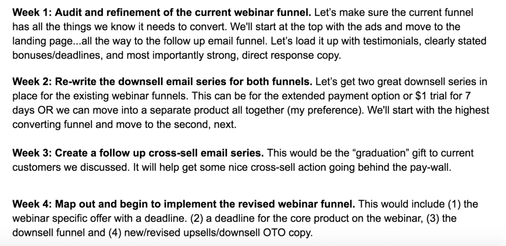 First of all, in the opening couple of lines, I’m giving him a compliment and re-iterating the problem we discussed on the call: The fact that there’s considerable work to do on the conversions and revenue for his webinar funnel.