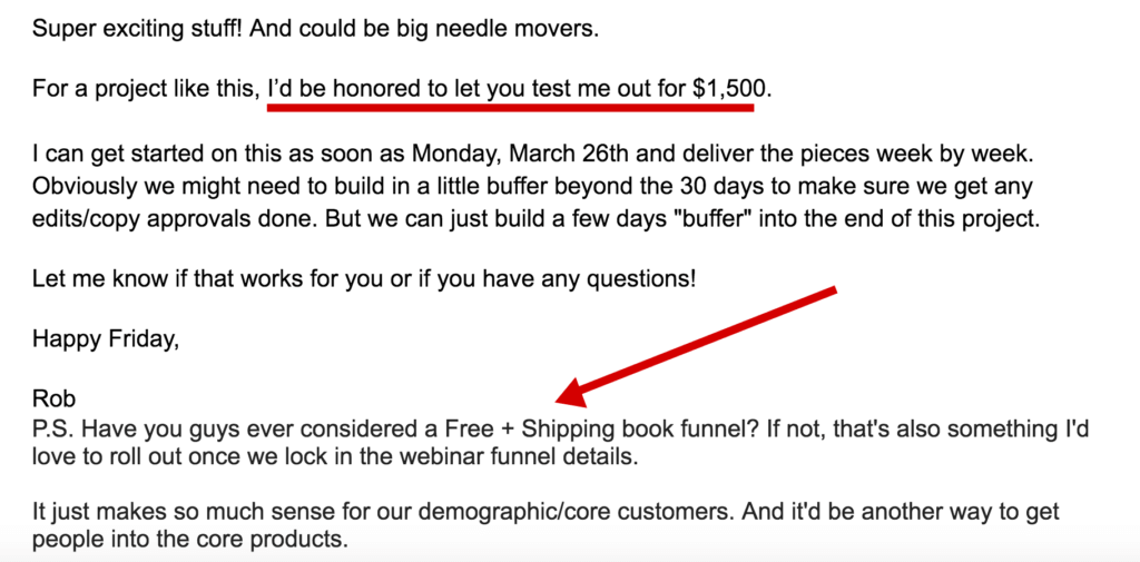 Notice I said, “For a project like this, I’d be honored to let you test me out for $1,500.”