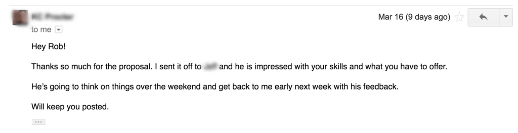 Needless to say, I was nervous to get the business I’d sent proposals to last week.