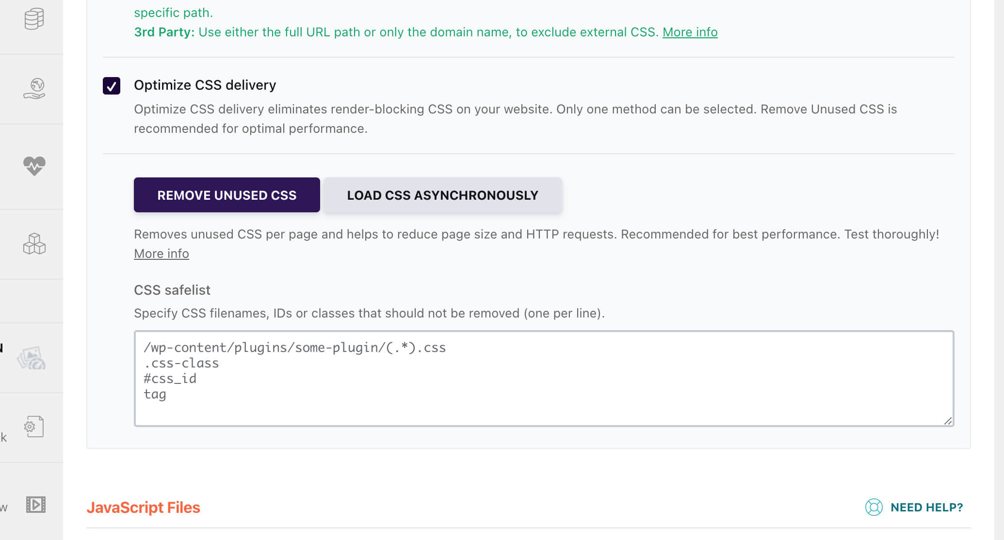 Luckily all of these assets can easily be minified without affecting the user’s experience. WP-Rocket offers a file optimization page with minification options for CSS and JavaScript. Additionally if page caching is enabled in WP-Rocket HTML minification will be applied to pages. A free options is to use the Autoptimize plugin to minify CSS/JS/HTML.